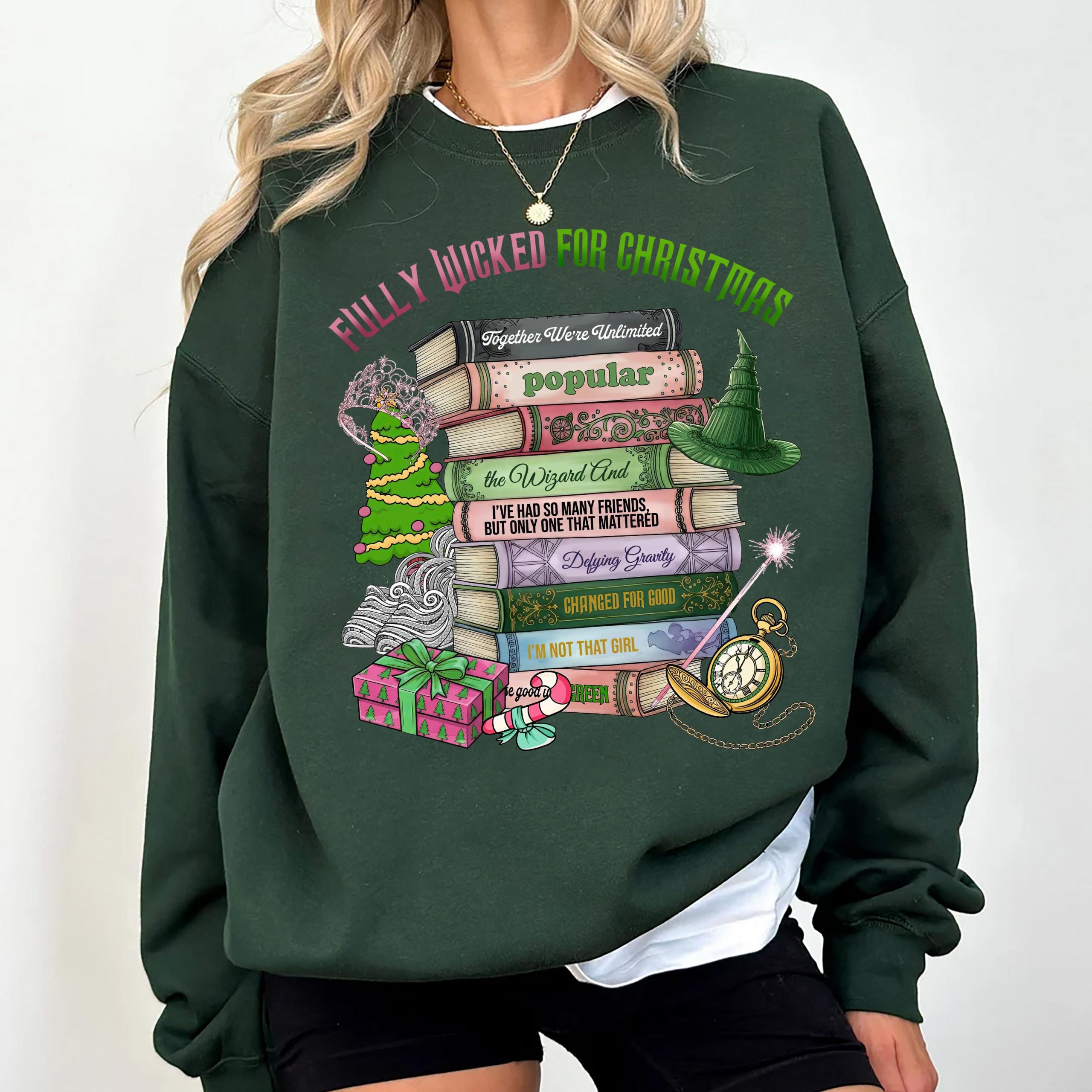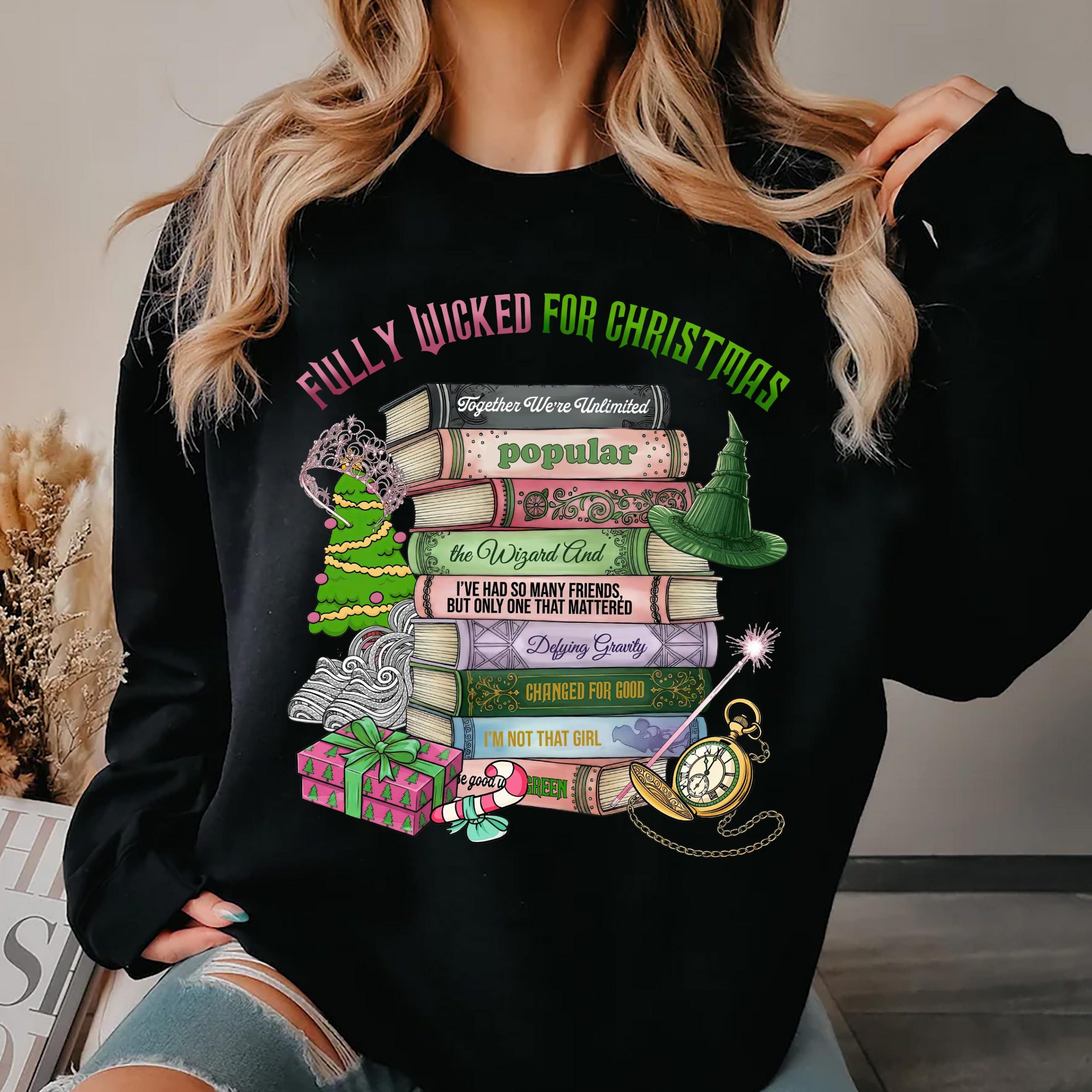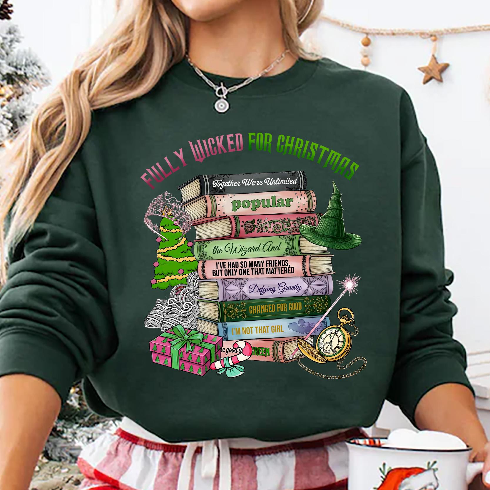 Fully Wicked For Christmas Shirt, Cute Book Lover Holiday Crewneck, Festive Reading Themed Pullover, Wicked Book Stack, Wicked Movie Shirt