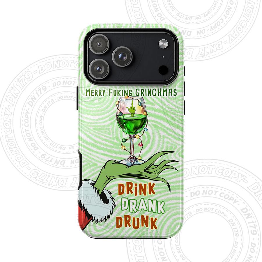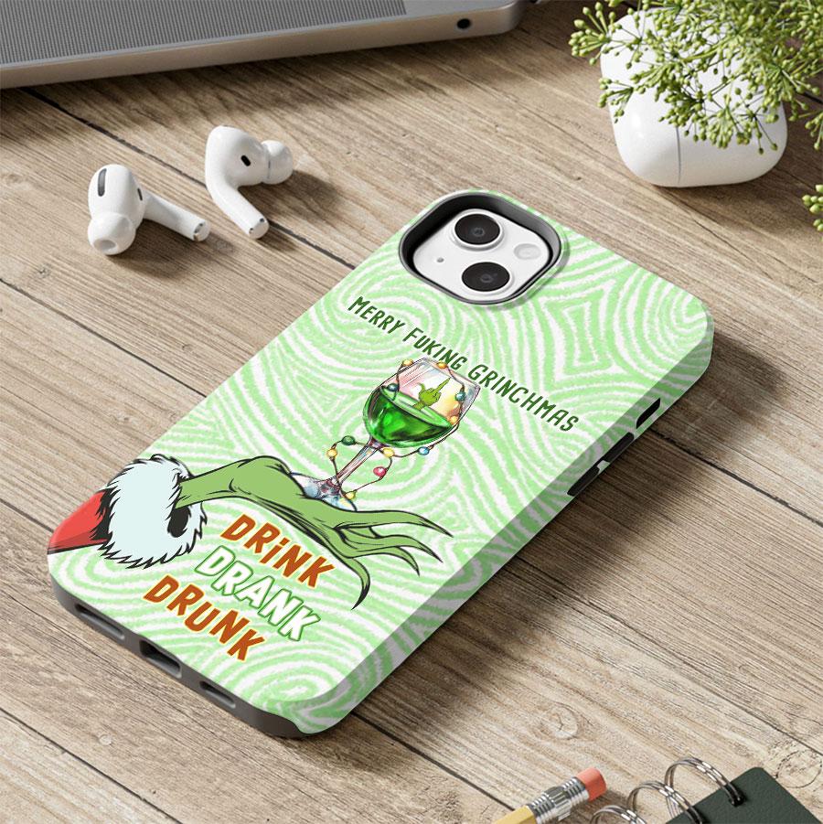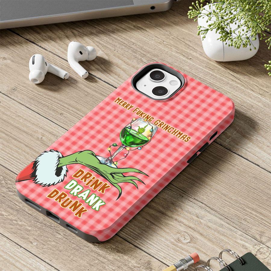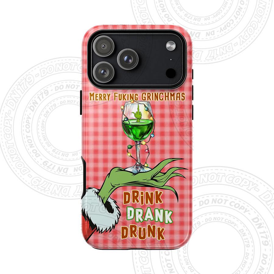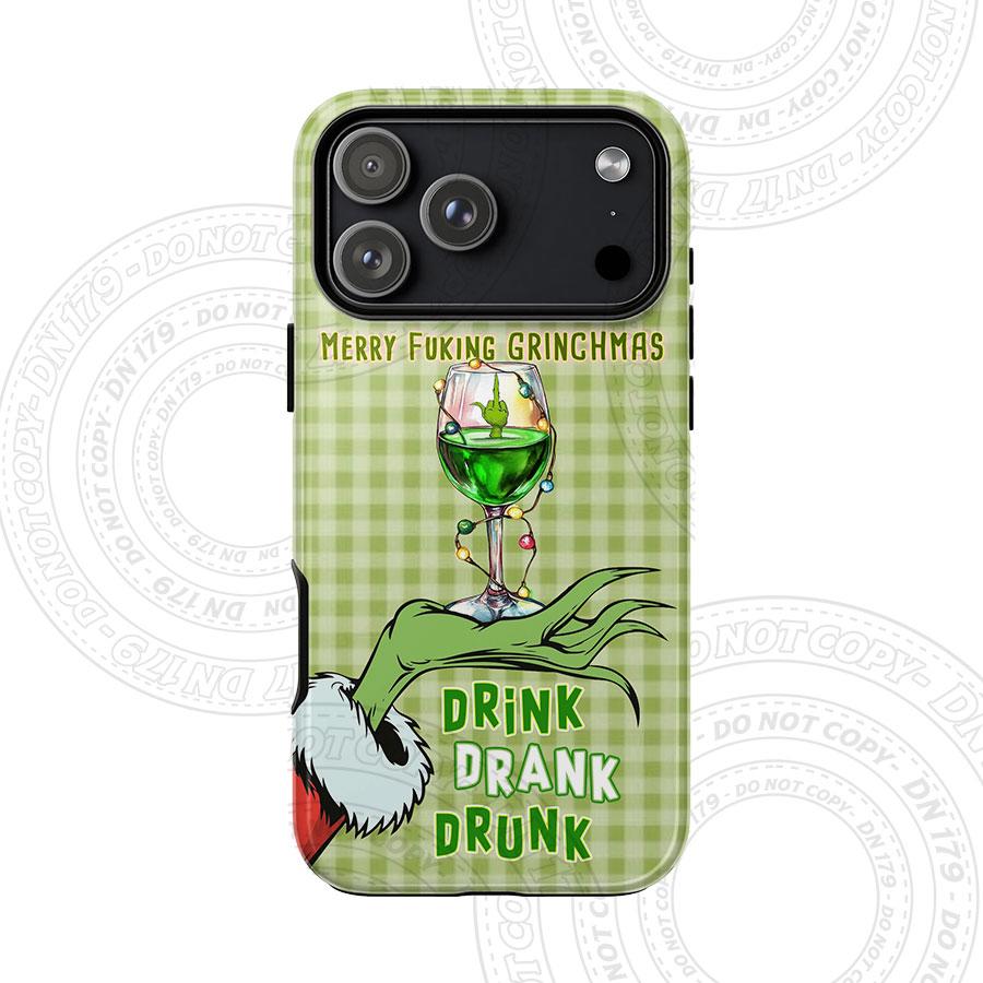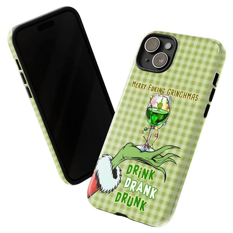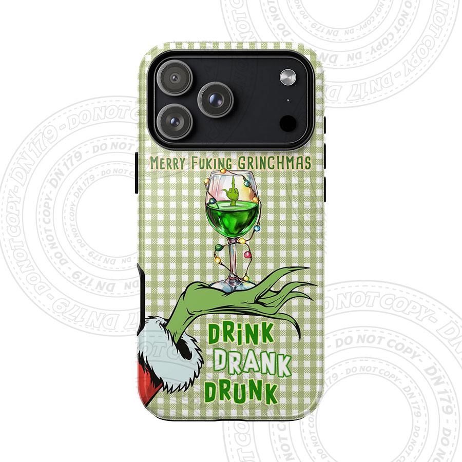 Funny Christmas Phone Case, “Drink Drank Drunk” Holiday Wine Design, Green Plaid Retro Aesthetic Cover for iPhone 7–17, Samsung S21–S25 & AirPods, Trendy Xmas Gift for Him & Her