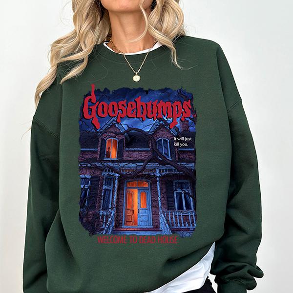 • Iconic Design: The shirt features the original book cover graphic for Welcome to Dead House – an atmospheric haunted house with the eerie taglines “It will just kill you” and “Welcome to Dead House”.