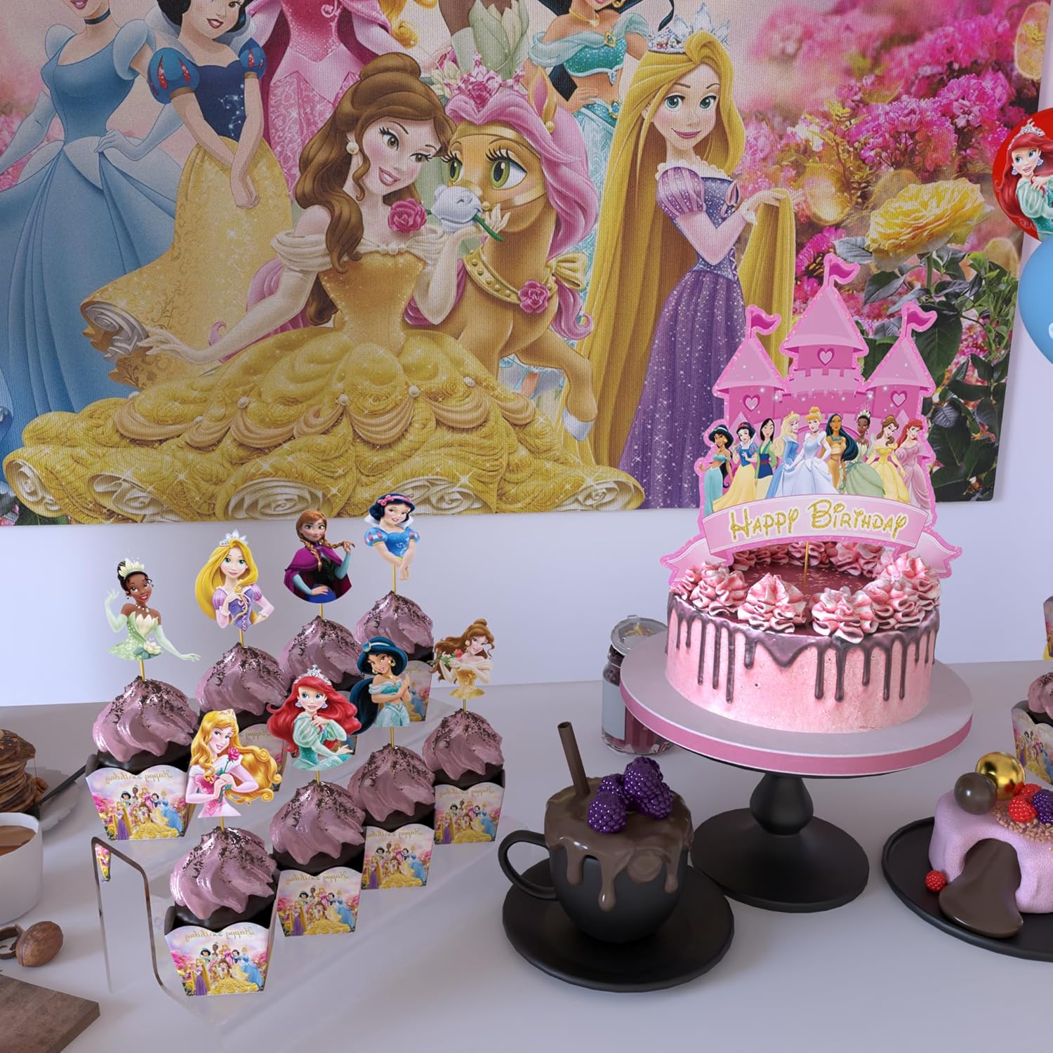 Nelton Party Supplies For Princess Includes Cake Topper, 24 Cupcake Toppers, 20 Latex Balloons, Happy Birthday Backdrop, 1 Table Cloth , 1 Banner